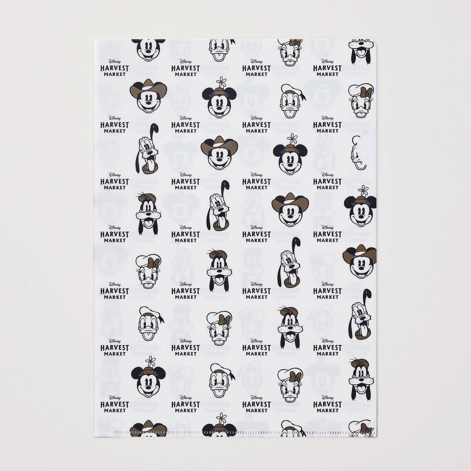 Disney HARVEST MARKETオリジナルのミッキー&フレンズのフェイスが全体にプリントされたA4サイズのクリアファイルです。書類整理はもちろん、レシピや思い出のものを入れても◎